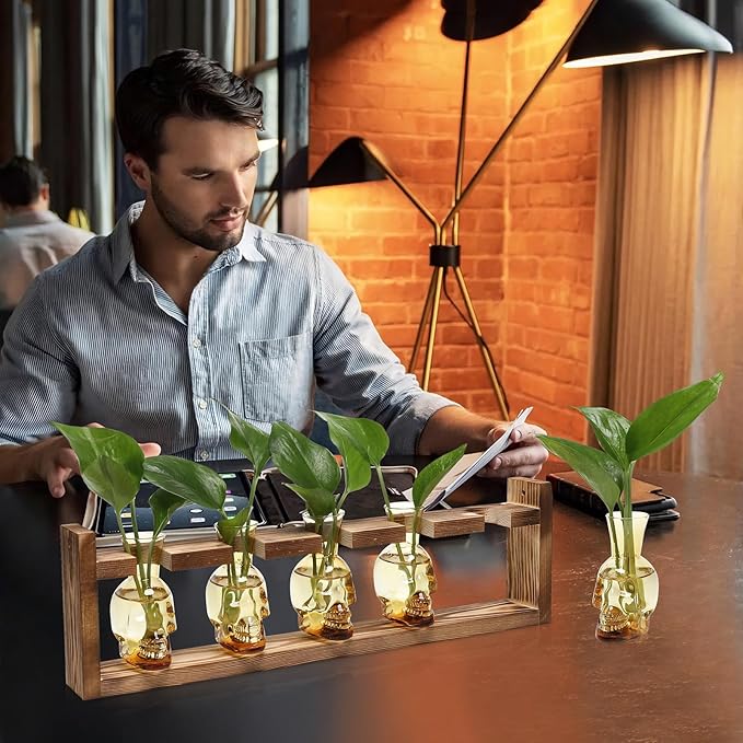 Plant Terrarium Propagation Stations Halloween Skull Planter Vase Skulls Decor with Wooden Stand Gife for Father - 5 Vases