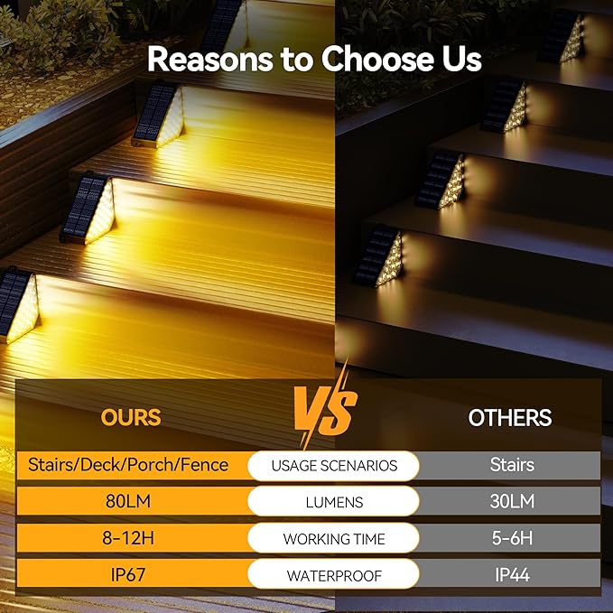 - 【24 LEDs / 80 Lumens】The solar stair lights outdoor waterproof is equipped with 24 superior LED beads paired with highly focused bead lenses, plus a powerful 80-lumen output. Its coverage area is 2X that of others, providing concentrated and sufficient light for clearer nighttime illumination