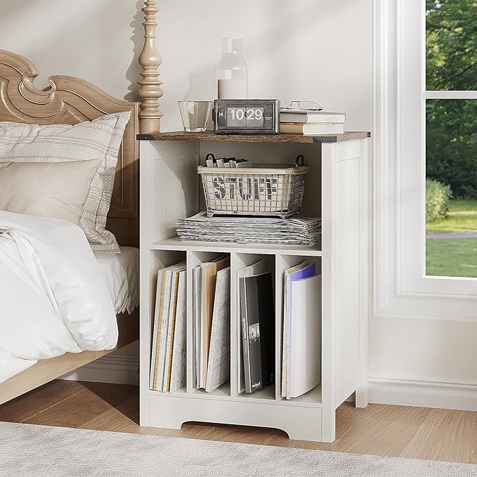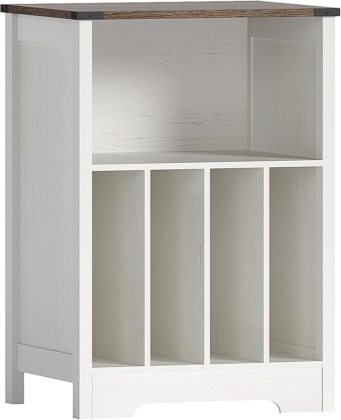 - 【Farmhouse Design】The record player stand features a rustic white and brown color scheme, complemented by four-cornered iron elements, which combine simple modernity with retro elements