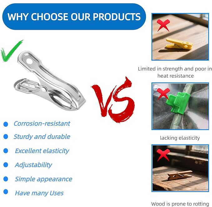 - 【Stainless Steel Construction】Made from durable stainless steel (note: the spring itself is not stainless), these clamps are more reliable and long-lasting than traditional wood or plastic clips, suitable for repeated outdoor use.