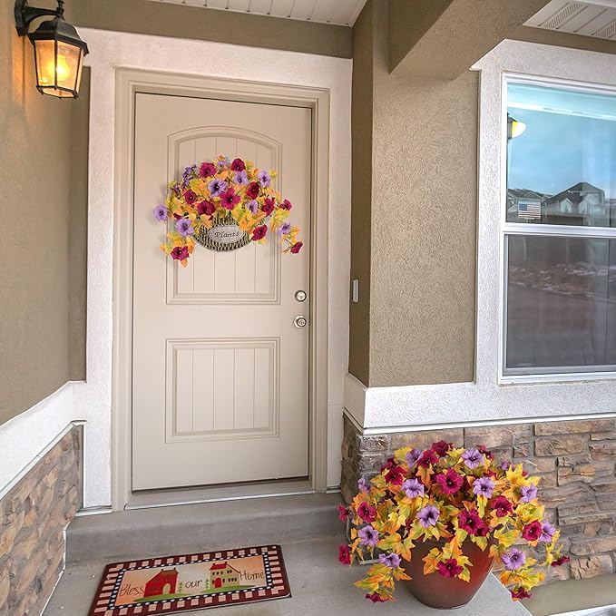 - Versatile Fall Decor: Whether for outside garden, patios, front door, balcony or indoor like living rooms, kitchen,bathroom, even for special events, this artificial flower arrangement offers endless decorating possibilities. Its versatility allows you to effortlessly enhance any setting and seasons, adding a splash of color and life
