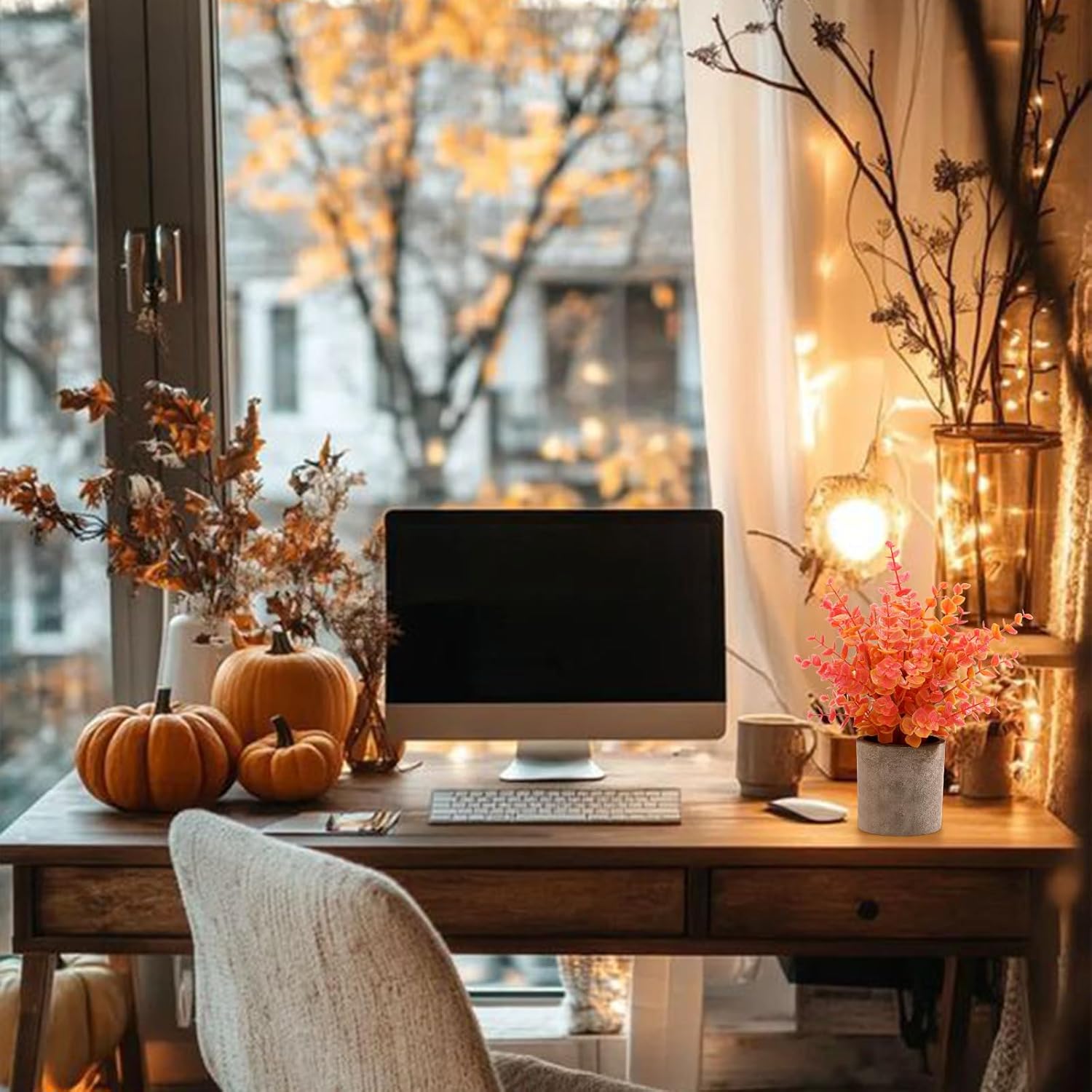 2 Pack Fall Small Fake Plants Eucalyptus Potted Artificial Plants Fall Decorations for Home Shelf Office Bathroom Desk Farmhouse Room Coffee Table Decor Fall Decor (Fall Orange)