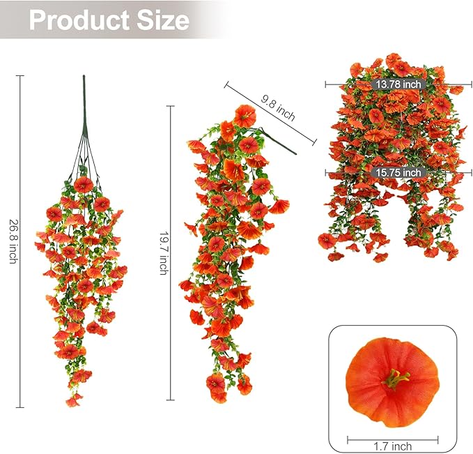 - 🌧【All-Weather Durable – Waterproof & Fade-Resistant】The artificial flowers outdoor are crafted from premium-grade plastic, these artificial hanging flowers' morning glory are waterproof and UV-resistant. They won't fade, crack, or become brittle, even under direct sunlight or heavy rain. Perfect for year-round use in any climate – no shelter needed.