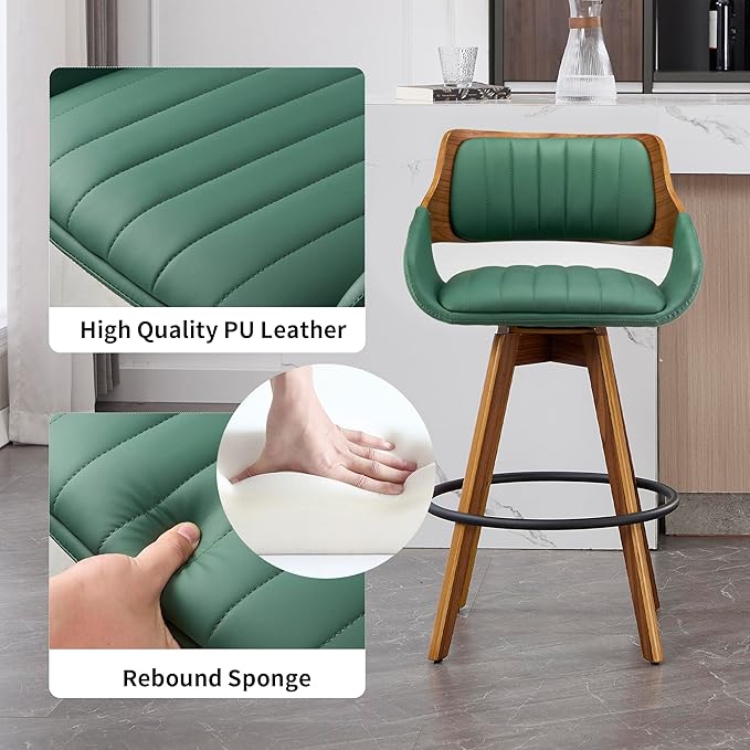 26" Bar Stools Set of 2, PU Leather Counter Height Bar Chairs with Back, Modern Mid-Century Swivel Barstools for Kitchen Island, Dining Room, Home Bar and Lounge, Green
