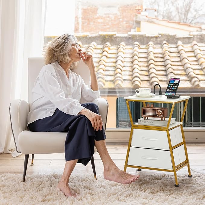Nightstand with Charging Station, Side Tables for Bedroom with Built-in USB Side Table with 2 USB Ports and Outlets Nightstand with Cloth Drawer End Tables Living Room Sofa Couch