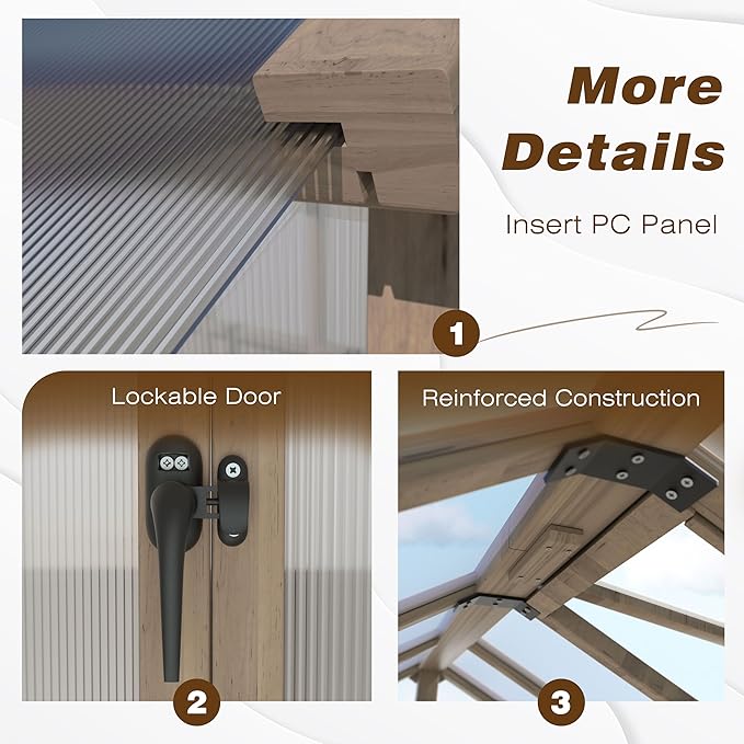 - Strong and Cold-resistant Cedar Frame - Our wooden greenhouse retains the original characteristics of pine and has natural weather resistance, providing an ideal environment for your outdoor gardening. The thick cedar frame of the greenhouse makes the structure stable, ensuring the longevity and durability of the whole season