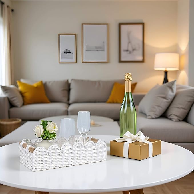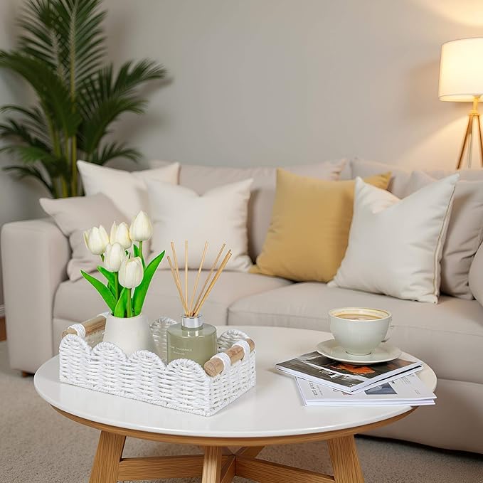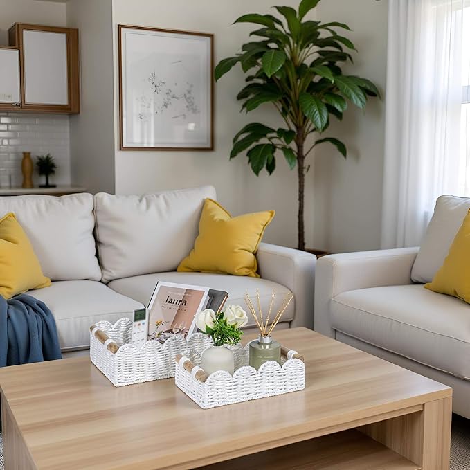- MULTIPURPOSE USE: Our scalloped edge paper rope decor basket add personality and charming addition to bedroom, living room, bathroom and space-floating shelves, over toilet storage shelf, end table, nightstand,storage cabinet, bookcase and more, also serve well to small items, beauty products, cleaning supplies, and more