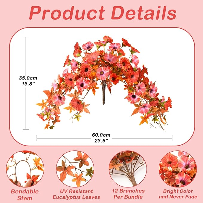 - Fake Fall Flowers Set of 2: The Package includes 2 pcs artificial petunias for outdoors, Each fall fake flowers measures 13.8" (L) x 23.6" (W), removable orange silk flowers and leaves make you can create stunning artificial flower arrangements for this autumn