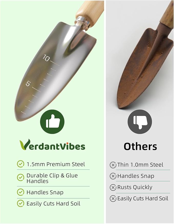 - Premium Stainless Steel Construction:Crafted with heavy-duty stainless steel gardening tools, this set resists rust and corrosion even in harsh weather. Lightweight yet unbreakable, the gardening hand tools maintain sharp edges for effortless digging, pruning, and planting – perfect for daily outdoor planting essentials.