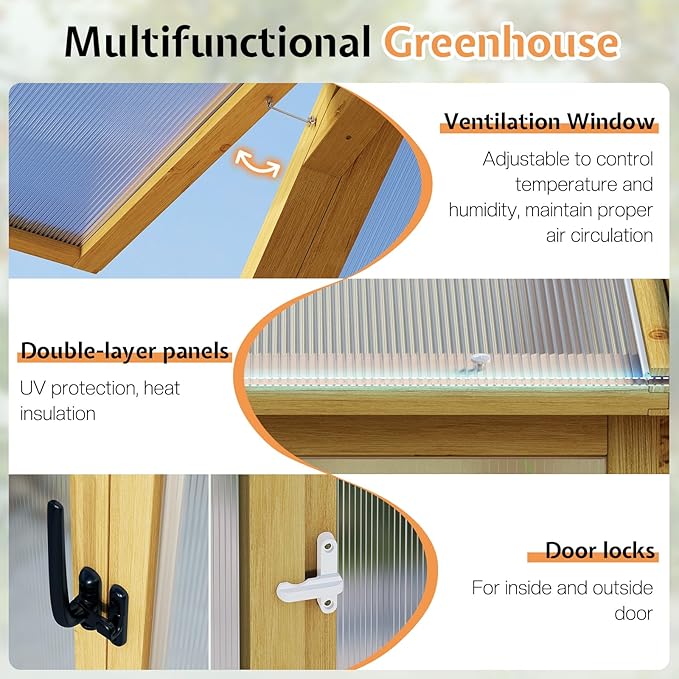 - Sturdy Wood Frame: Wood greenhouse built with premium cedar and reinforced metal hardware for durability. Wind rating reaches 24-38mph and the maximum load capacity is 440lbs, which ensure stability in various weather conditions