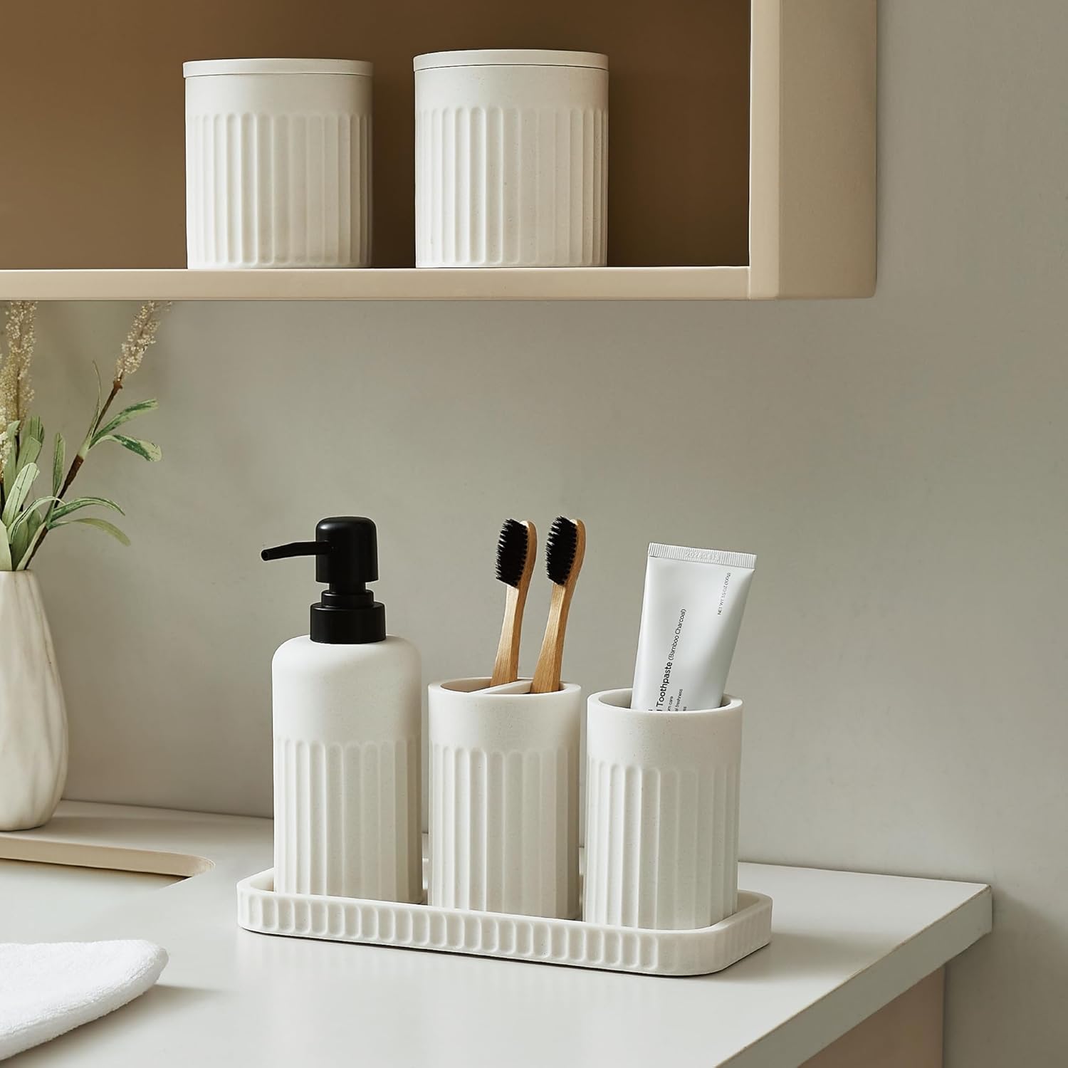 - Elegant Design: The bathroom soap dispenser set features fine and smooth sand finish and exquisite lines, providing a pretty and attractive appearance. With perfect neutral colors, the bathroom accessories sets complete effortlessly blends into and elevates any bathroom, from contemporary to classic.