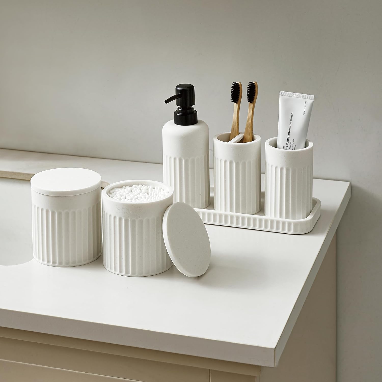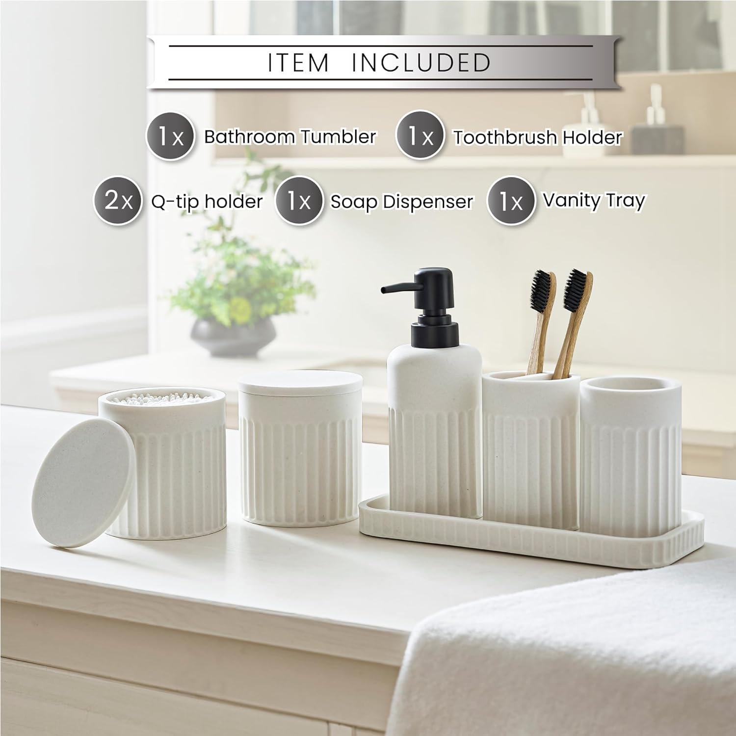 - Item Includes: The 6-piece bathroom sets accessories contain a soap dispenser, a toothbrush holder, a bathroom tumbler, a vanity tray and 2 qtip holder. Every bathroom accessories countertop are well-made, including all the essential pieces for a tide and organized bathroom.