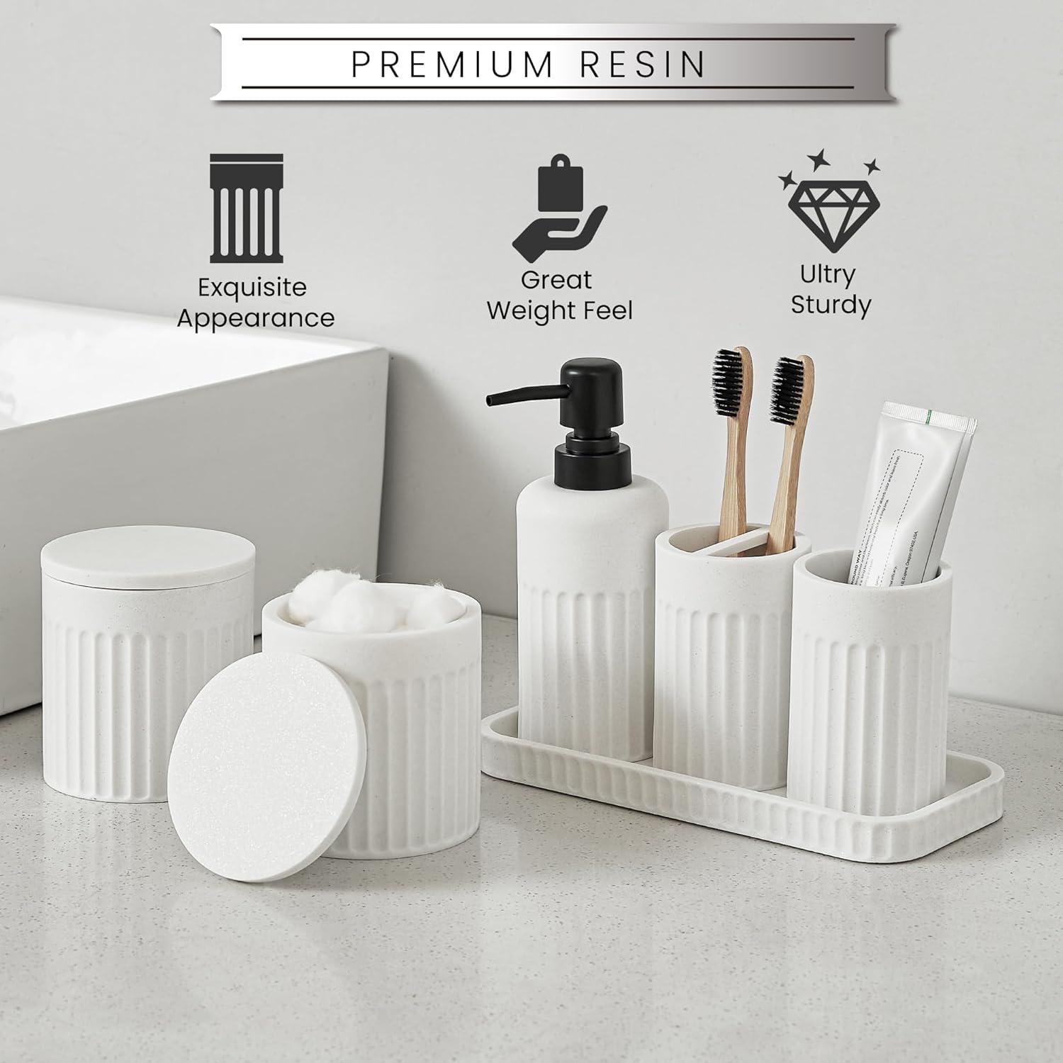 - Nice Resin Material: The bathroom toothbrush holder set is made from premium resin, sturdy and well finished, pleasant to touch. Unlike flimsy plastic, these bathroom counter set has a good weight to them, don’t tip over or slide around the counter.