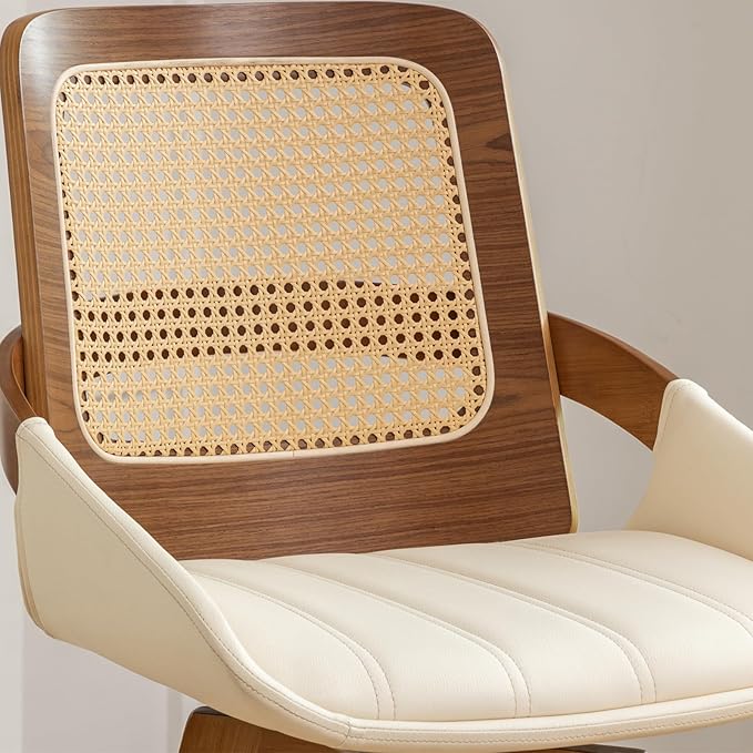 Mid Century Modern Counter Stools - 29.5 inch Swivel Rattan bar stools with Cane Back, Upholstered Faux Leather, Walnut Craftsmanship (Walnut Beige, Set of 3/30 inch)