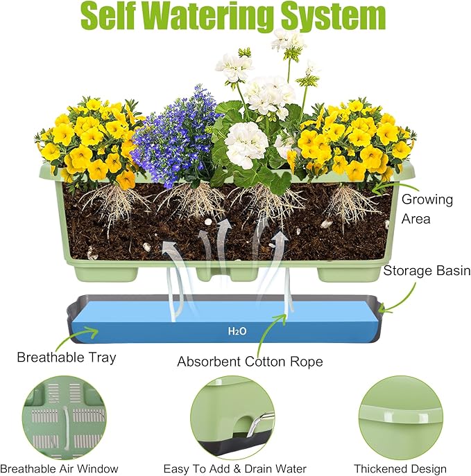 - 【Premium & Durable】The planter pots are made of high quality PP material and has been thickened to bear up to 300KG (660LB). This window box planter is sturdy, wear-resistant and durable. It can be exposed to light, wind, and sunlight for long periods of time, with a lifespan of decades. It is an excellent planter box for both indoor and outdoor.