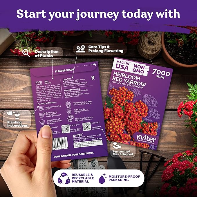 KVITER 7000 Red Yarrow Seeds (Achillea Millefolium Rubra) — Perennial Flower Seeds to Plant Outside, Heirloom & Organic — Native Wildflower Seed for Herb Garden, Beds, Containers & Meadows