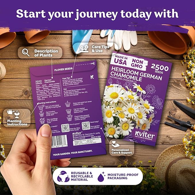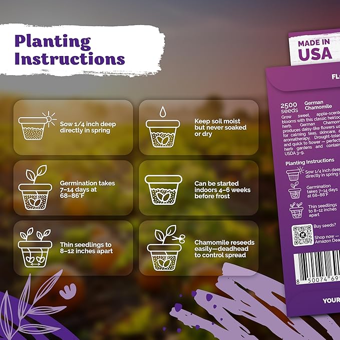 - High Germination Rate: Chamomile seeds sprout in 7‑14 days at 68‑86°F when sown 1/4 in deep and misted; enjoy up to 95 % success in USDA 3‑9 for chamomile flowers in herb gardens or containers.
