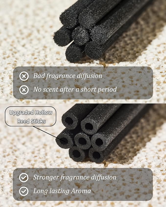 - Upgraded Hollow Reed Sticks - Outperform solid sticks with stronger scent diffusion and wider coverage. Dust-resistant design prevents clogging, ensuring long-lasting fragrance without fading.