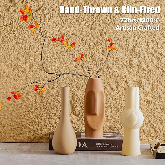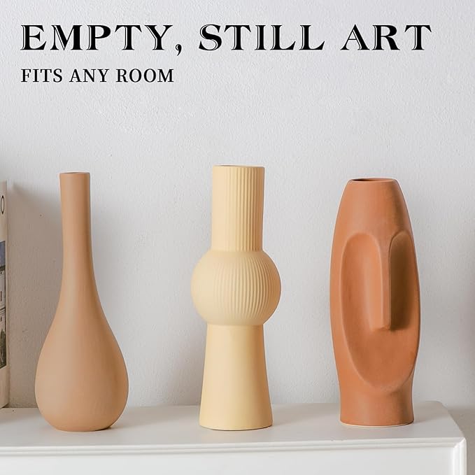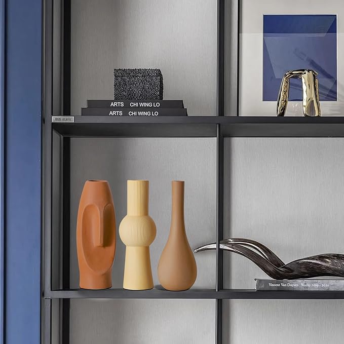 - 【Minimalist Design, Timeless Adaptability】 Embrace minimalist decor with sleek silhouettes that complement boho, mid century modern, rustic farmhouse decor, or coastal, western, vintage home decor. Perfect for shelf, bookshelf, coffee bar, console table, dresser, office desk or TV stand decor, these decorative vases blend seamlessly into any house decor theme.