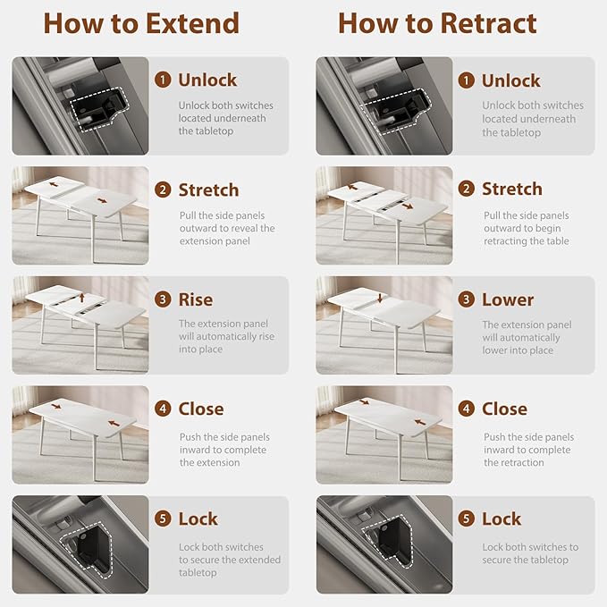 - 【QUICK EASY SETUP】This extending table arrives well protected. Simply attach 4 legs using the included tools and instructions to complete assembly. Enjoy 2 year warranty and 24/7 customer support