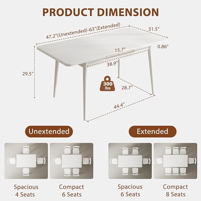 - 【FLEXIBLE SEATING OPTIONS】This expandable dining table extends from 47.2" to 63". Comfortably seats 4 for everyday use and up to 8 when expanded for meals, gatherings, or fun nights in limited spaces