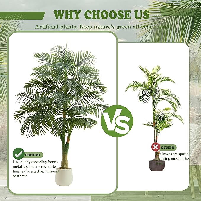 - 🌱 Easy Maintenance - Are you always forgetting to water your plants? Try FSOHOI fake trees! No sunlight, No watering, No pruning, No fertilizer required, artificial palm plant looks full and fresh daily. You'll love the vibrant feel that faux plants indoor bring to your room. If the faux tree gets dusty, wipe it off with a damp cloth or duster