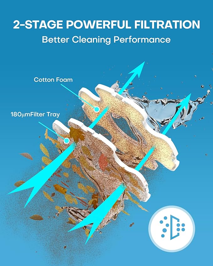 - 【Advanced Dual-Stage Filtration System】 This above-ground pool cleaner features a 180μm precision mesh filter paired with a multi-density foam layer, increasing filtration efficiency by 50% versus standard robots. Effortlessly traps everything from fine silt to leaves and sand, ensuring crystal-clear water with no debris left behind.