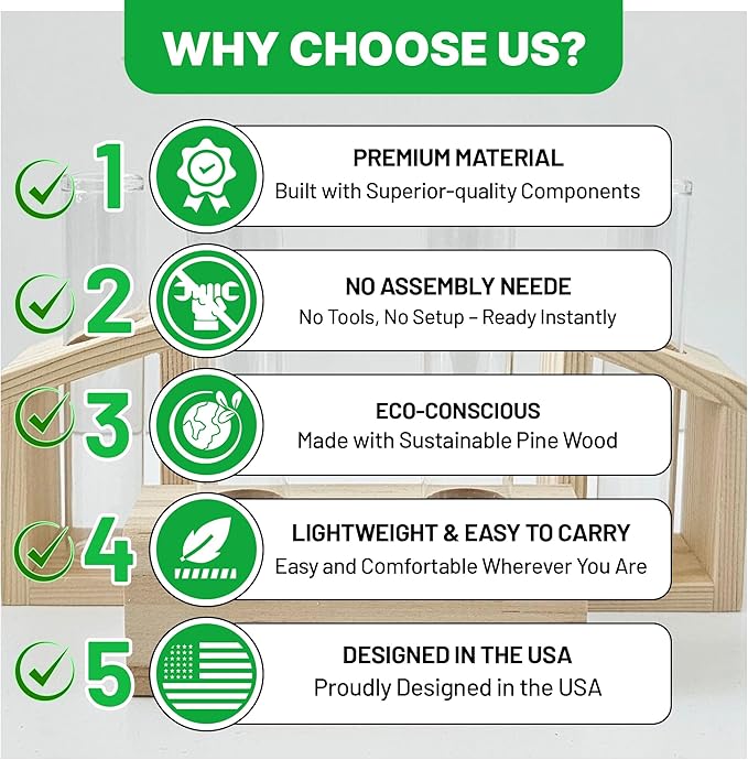 - Elegant Plant Propagation: Our plant propagation station is designed to showcase your plant cuttings elegantly. Featuring premium glass propagation tubes, it ensures an optimal environment for growing and displaying propagated plant holders.