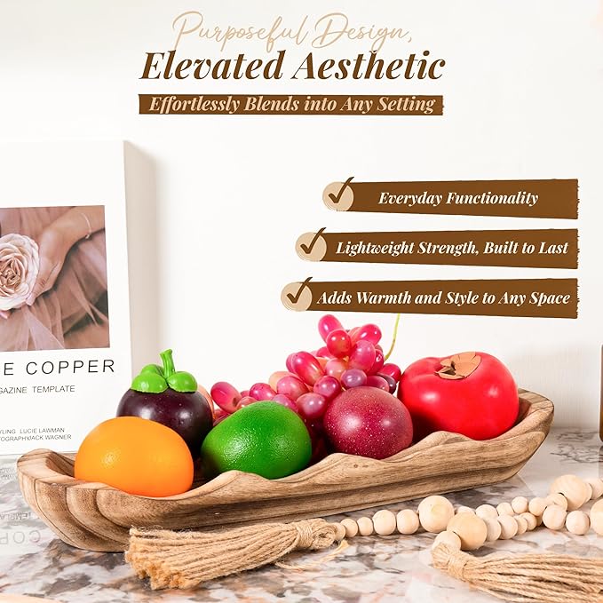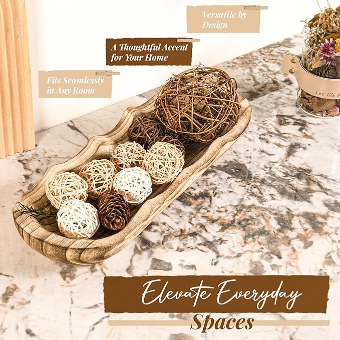 - 【MULTIPURPOSE】 This wooden bowl is highly versatile—use it as a kitchen island fruit bowl, candle holder, or a catchall for keys, coins, wallets, and other small items. Style it with rattan balls, mini succulents, natural stones, or seasonal decor like pinecones, ornaments, and holiday accents for Easter or autumn-inspired arrangements.