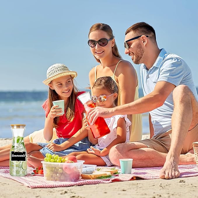 Glass Carafe Pitchers with Bamboo Lids, 4 pcs 1 Liter Beverage Serveware Pitcher Carafe Set for Mimosa Bar, Juice Container for Brunch, Cold Water, Juice -With 4 Wooden Chalkboard Tags