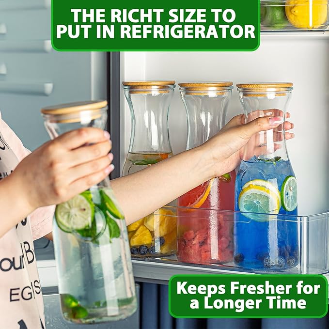 - JUST THE RIGHT SIZE AND NUMBER: There are 4 clear glass carafes in this pack, each one is 10.4" H x 3.6" W, can completely fitted in refrigerator door and interlayer. This is the right size for serving juices on mimosa bar and you can store the pitcher in the fridge for cold brewing or storage.