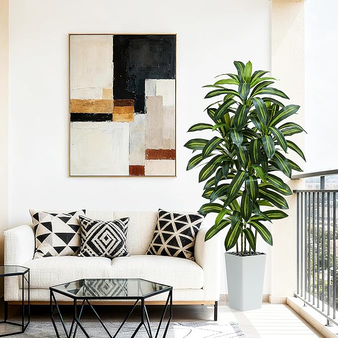 - [Durable Build. Thoughtfully Made.] Built with quality materials chosen for long-term indoor use, this fake dracaena plant is made to last. Unlike flimsy alternatives,our fake plant features fade-resistant, water-repellent components that help maintain its vibrant look and clean feel over time. No shedding leaves, no odd odors—just a consistently neat and polished appearance that enhances any space with confidence. Designed to deliver both visual appeal and peace of mind from the ground up.