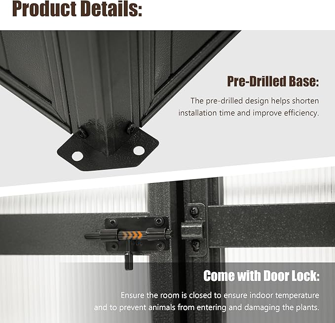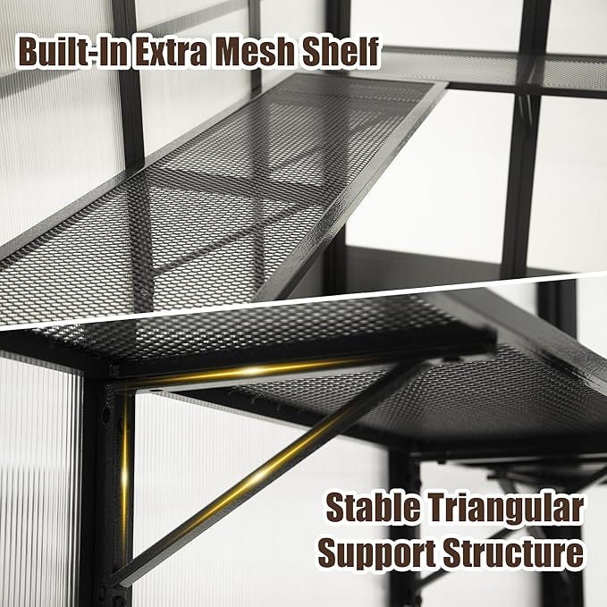 - Shatter-Resistant Polycarbonate Panels – Safe and Efficient: The greenhouse uses high-quality polycarbonate panels that are lightweight yet impact-resistant. They offer excellent light diffusion and UV protection, keeping your plants healthy while maintaining a stable internal climate.