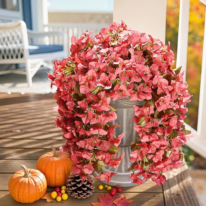 - ✅️ Realistic Hanging Flowers Fall Home Decorations: Beautiful fake fall flowers are suitable for home, garden, yard, porch, balcony, patio, window box, urn, planter, wall, fence, indoor and outside decorations. Brings beauty to your home. These faux bougainvillea outdoor are real looking and brings autumn beauty and joy to your home.