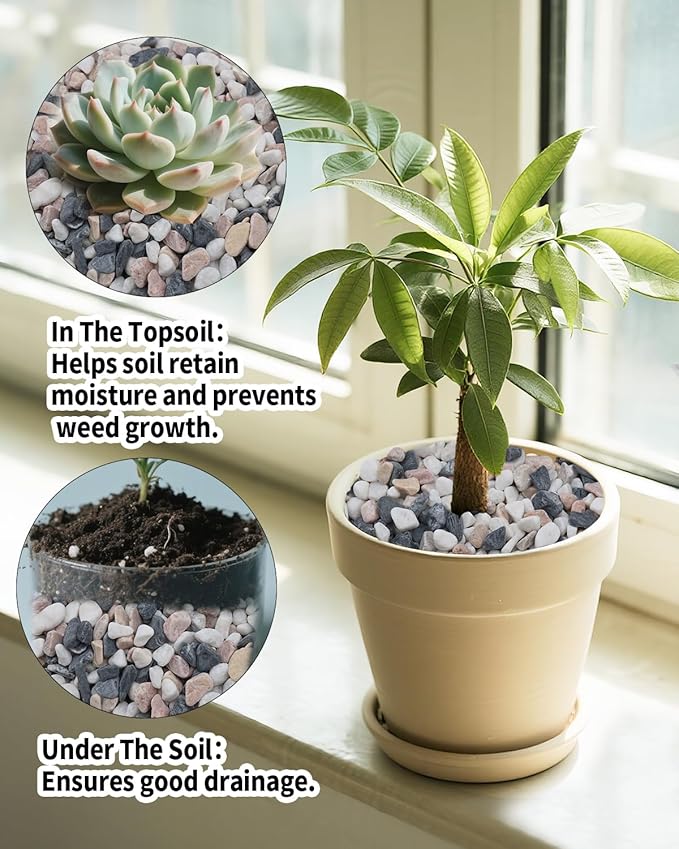 - Dual-Purpose Plant Solution - Use these pebbles as a decorative top layer to retain moisture, reduce soil splatter when watering, and create a protective barrier against pests—keeping your plants looking vibrant and healthy. As a bottom drainage layer, they promote rapid water flow to prevent root rot and overwatering, which are common issues for succulents and cacti that thrive in well-draining soil
