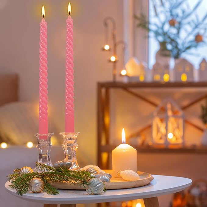 - Elegant Pink Spiral Design – Enhance your decor with these stunning 10-inch pink spiral taper candles, featuring a timeless twisted design that adds a touch of vintage charm to weddings, parties, and romantic dinners.