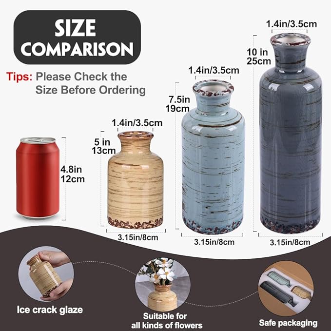 - Timeless Rustic Charm: These ceramic vases for home decor bring a rustic elegance to any space. Whether you display them as small vases for flowers or decorative vases for living room, their distressed finish and soft colors add warmth and character to farmhouse or modern interiors