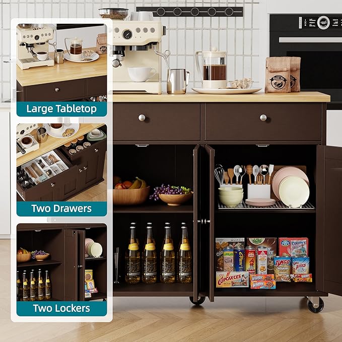 - Universal Rolling Wheels: Smooth-rolling wheels allow easy relocation to any room, while locking mechanisms secure the island in place. Keep essentials handy wherever you work, whether in the kitchen, dining area, or entertaining space.