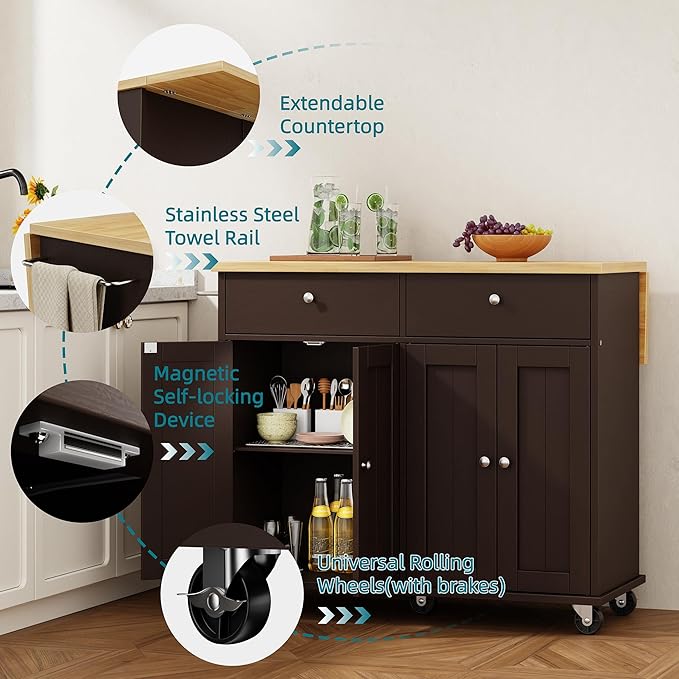 Shintenchi Kitchen Island with Drop Leaf, Rolling Kitchen Cart with Storage on Wheels, Table Bar Cart for Kitchen with Towel Rack & Seating Area for Dining Room, Brown
