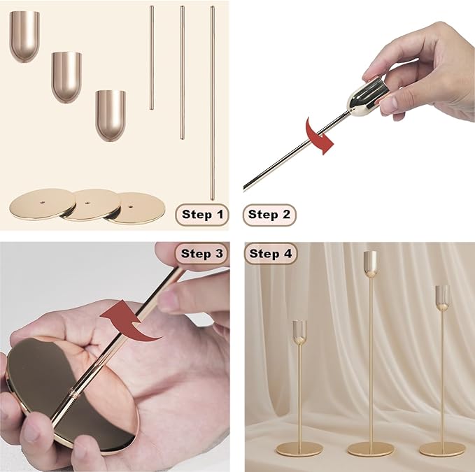 - [Easy to Assemble] These candelabra candle holders are very easy to assemble, just connect the candle cup with the candlestick rod, and then screw it into the base to complete the installation;And it can be quickly disassembled when not in use, easy to store, does not occupy too much place.