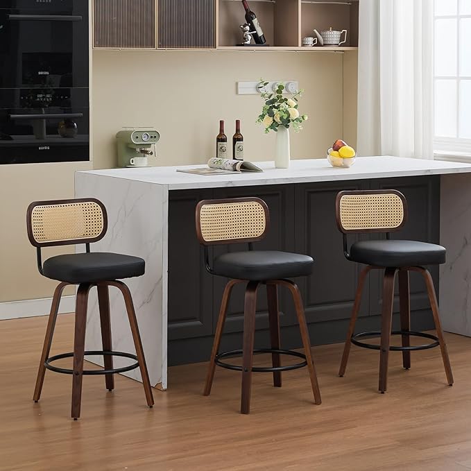 Swivel Counter Height Bar Stools Set of 3, 26 inch Bar Chairs with Curved Rattan Back, Upholstered PU Leather, Walnut Craftsmanship, Mid Century Modern Counter Stools for Kitchen Counter, Black