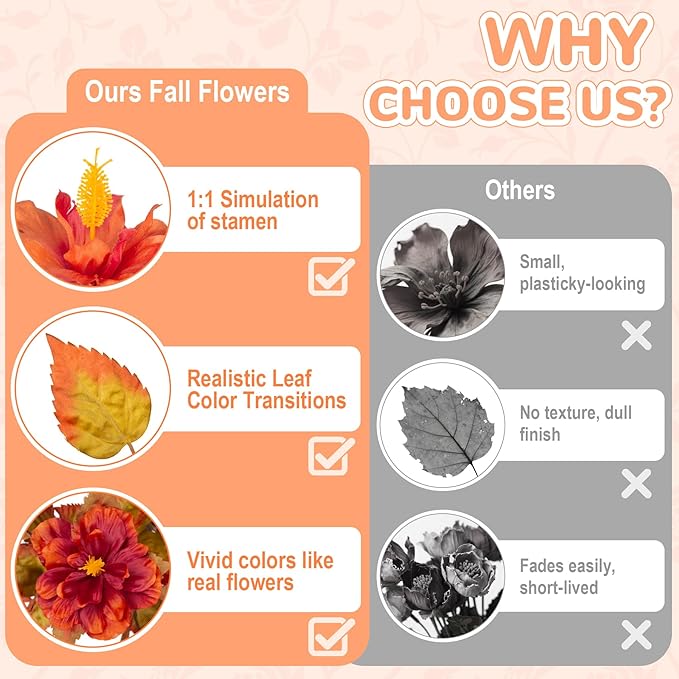 - No Maintenance Required: Say goodbye to watering, pruning, and sunlight concerns — our fall flowers artificial for decoration bring you all the beauty of nature without the upkeep. Ideal for busy homeowners, offices, or anyone who loves the look of fresh flowers without the hassle.