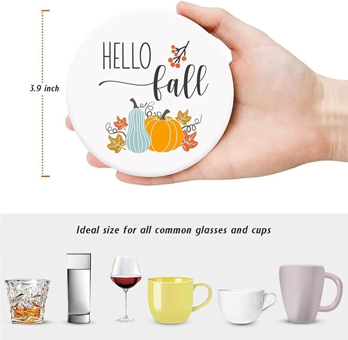 - SEASONAL DESIGN: Set of 6 ceramic coasters featuring charming watercolor pumpkin patterns and autumn-themed phrases, perfect for fall home decor and entertaining
