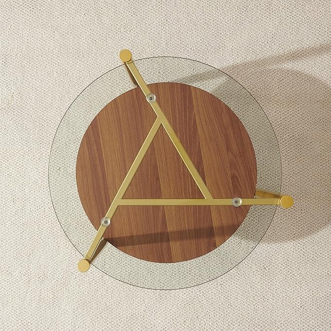 - Mid - Century Modern Design: This mid - century modern end table features a round silhouette, with a tinted clear glass top boasting smooth rounded edges—this thoughtful beveled design not only enhances its sleek, polished look but also adds sturdiness and safety, eliminating sharp corners for peace of mind. It showcases a unique structure with golden conical legs and a walnut - hued MDF lower shelf. The striking contrast between the glass, walnut - hued MDF, and metal elements brings a sense of harmony and retro - chic style to the space, reflecting the owner's refined taste for classic yet stylish furniture.