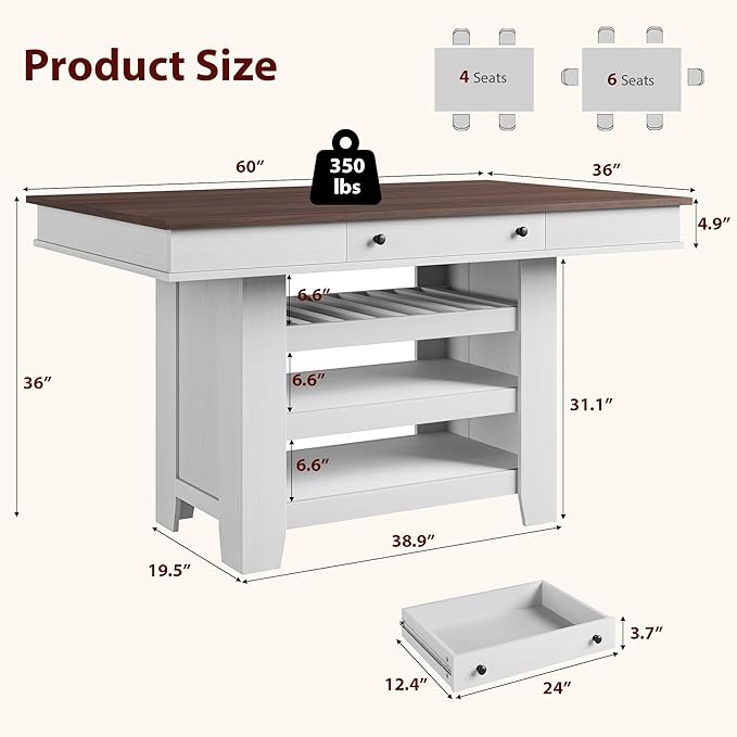 GAOMON 60" Counter Height Dining Table for 4, Farmhouse Rectangular Tall Bar Height Kitchen Dining Table & Thick Table Top, with Deepened Wine Rack & Shelves for Kitchen, Bar,Retro White & Brown