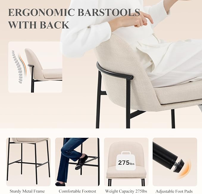 - ERGONOMIC BAR STOOLS WITH BACK: Bar stools with premium material & ergonomic backrest.Thick cushioned back & double cushion for a comfortable seating experience. Ergonomically designed seat for optimal comfort during long periods of sitting. The soft cushioned seat provides ample comfort for long periods of sitting, making it great for enjoying a meal at the kitchen counter or having a drink at the bar.
