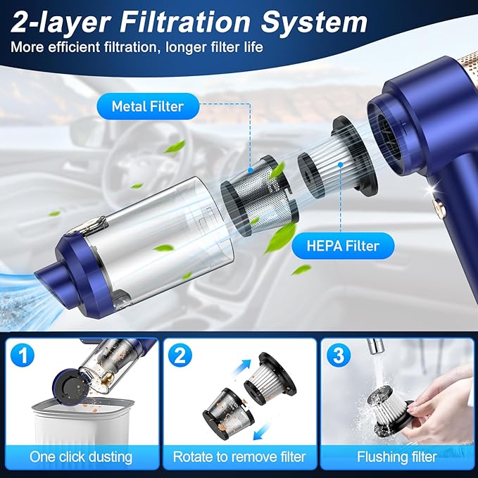 - 【Dual-layer Filtration System】Small vacuum cleaner with a metal filter and a HEPA filter, metal filter can effectively filter out large mess and debris, and HEPA filter can filter out fine dust and particles. The filters are washable and reusable, and an extra HEPA filter is included for replacement. Please make sure to dry the filters before using them again. The upgraded one-click dust dumping function allows for easy removal of small debris and crumbs.