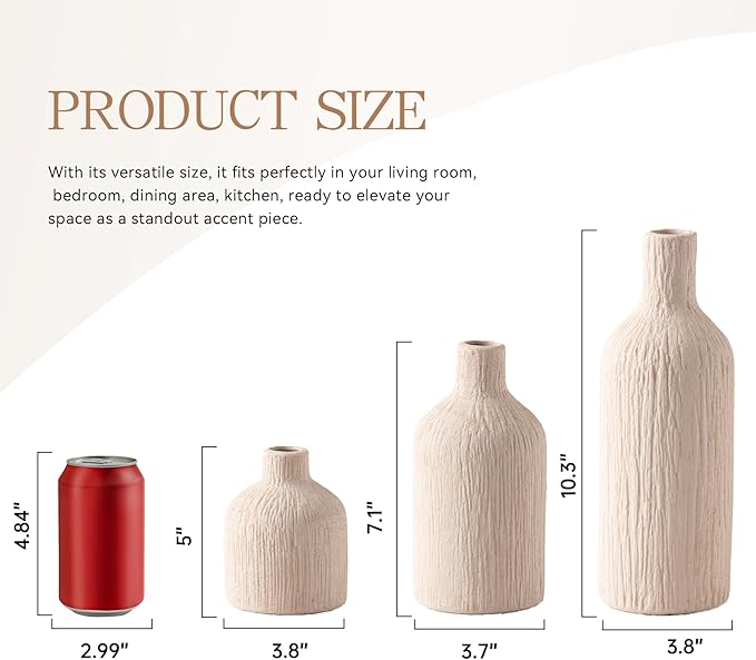 - 【Perfect Size】Large: 3.8"L × 10.3"H;Medium: 3.7"L × 7.1"H;Small: 3.8"L × 5.0"H. Featuring intricate detailing and a rich texture, this vase complements a variety of home styles—farmhouse, rustic, country, even modern. It effortlessly blends in with existing furniture and accessories, adding a timeless charm and harmonious look to your space.