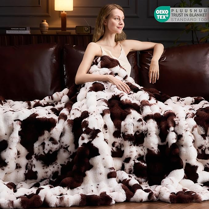 Faux Fur Throw Blanket for Couch, Fluffy Fuzzy Plush Bubble Blanket, Soft Warm Cozy Shaggy Rabbit Blanket, Luxury Decorative Gifts for Sofa Bedroom Living Room, 90x90inch (Cow Print-Brown)