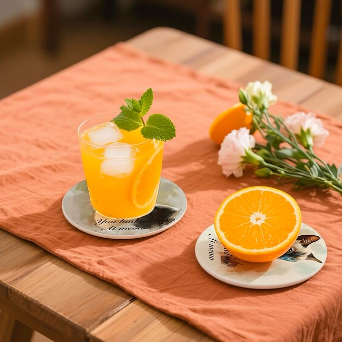 - Complete Set of 6 with Convenient Holder:Includes six (6) uniquely designed cat coasters and a matching holder for neat, organized storage and display. Keep your surfaces tidy and your coasters easily accessible.